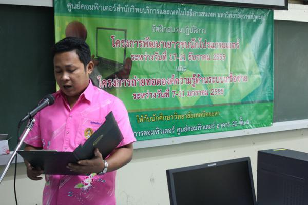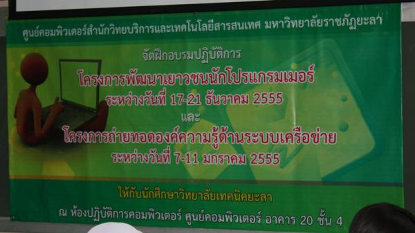 เมื่อวันที่ 7 มกราคม 2556 ศูนย์คอมพิวเตอร์ สำนักวิทยบริการและเทคโนโลยีสารสนเทศ ได้ดำเนินการจัดโครงการฝึกอบรมปฏิบัติการ เรื่อง การถ่ายทอดความรู้ด้านระบบเครือข่าย หลักสูตร “ Ubuntu and pfSense Server Administrator ” ได้จัดขึ้นตามข้อตกลงความร่วมมือการดำเนินกิจกรรมเครือข่ายชุมชนทางการศึกษา วิจัย บริการวิชาการและการจัดการทรัพยากรสารสนเทศ ระหว่าง ศูนย์คอมพิวเตอร์ สำนักวิทยบริการและเทคโนโลยีสารสนเทศ กับ วิทยาลัยเทคนิคยะลา ระหว่างวันที่ 7-11 มกราคม 2556 มีผู้เข้าร่วมฝึกอบรมประกอบด้วย อาจารย์ นักศึกษาระดับ ปวช. ปวส. จากวิทยาลัยเทคนิคยะลา รวมทั้งสิ้น 30 คน โดยมีผู้อำนวยการศูนย์คอมพิวเตอร์ อาจารย์ปรีชา พังสุบรรณ เป็นประธานในพิธีเปิดและ รองผู้อำนวยการวิทยาลัยเทคนิคยะลา นายณรงค์ ปานเพ็ชร กล่าวโอวาทแก่นักศึกษา ณ ห้องปฏิบัติการคอมพิวเตอร์ ศูนย์คอมพิวเตอร์ อาคาร 20 ชั้น 4
